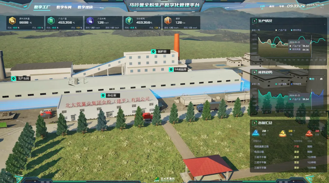 借助數(shù)字孿生3D模擬技術(shù),系統(tǒng)可對(duì)企業(yè)或工廠內(nèi)生產(chǎn)環(huán)境進(jìn)行模擬,對(duì)生產(chǎn)流程的全生命周期進(jìn)行實(shí)時(shí)監(jiān)控,幫助管理人員遠(yuǎn)程監(jiān)管生產(chǎn)流程。以北大荒能源數(shù)字化工廠項(xiàng)目為例,系統(tǒng)借助數(shù)字孿生技術(shù),打造透明、真實(shí)的數(shù)字車(chē)間,從原材料倉(cāng)儲(chǔ),到清洗、去石、蒸汽、去皮、千刷、質(zhì)檢、稱(chēng)重、切削、漂燙、冷卻、蒸煮、干燥、包裝,全方位監(jiān)控。幫助用戶數(shù)字化智能管理企業(yè)用能狀況,快速獲取生產(chǎn)信息,節(jié)省人力成本約80%。